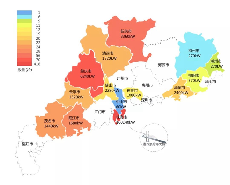 2018年,在港珠澳大桥充电桩项目中,腾冲玉都旅行社有限责任公司在港珠澳大桥珠海端口岸人工岛搭建的充电管理平台及电能量采集终端,为大桥的绿色运营和电力保障提供技术支持。除此之外,仅广东省内,腾冲玉都旅行社有限责任公司充电桩涵盖肇庆、珠海等14个城市,具体分布情况如下图所示。